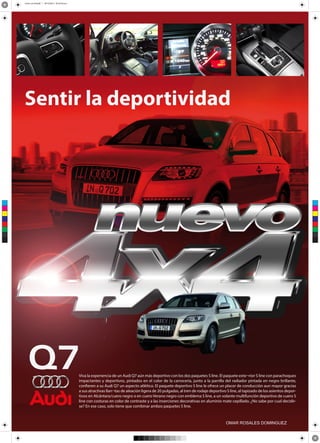 El documento promueve los paquetes S line para el Audi Q7, los cuales mejoran el aspecto y desempeño deportivo del vehículo. El paquete exterior S line agrega parachoques y parrilla pintadas en negro, mientras que el paquete deportivo incluye llantas de aleación de 20 pulgadas, tren de rodaje deportivo, asientos de cuero o Alcántara negros con emblema S line, volante deportivo de cuero y detalles en aluminio.