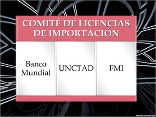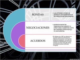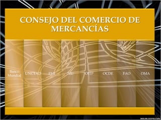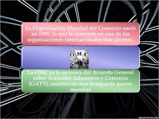 La Organización Mundial de Comercio (OMC) es el organismo internacional que establece las normas del comercio global. Tiene como objetivo asegurar que el comercio fluya libremente entre los países miembros. Cuenta con 153 países miembros y se estableció en 1995 tras las negociaciones de la Ronda Uruguay. Su estructura incluye el Consejo General y la Conferencia Ministerial como órganos superiores de toma de decisiones.