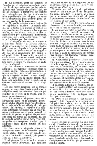 El documento resume los requisitos y efectos de la adopción en la ley romana y en los códigos napoleónico y prusiano. Bajo la ley romana, solo podían adoptar aquellos capaces de tener hijos, mientras que los impotentes no tenían impedimento. La adopción debía ser permanente pero el adoptado podía solicitar la emancipación a la mayoría de edad. Los tutores no podían adoptar a sus pupilos. El Código prusiano exigía el consentimiento de varias partes y producía efectos como el cambio de