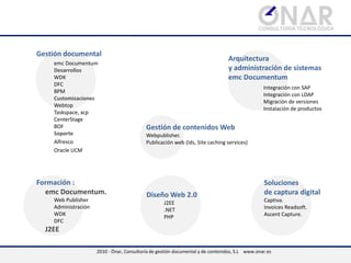Onar es una empresa española fundada en 2010, especializada en consultoría tecnológica con sede en Madrid. Su enfoque está en el desarrollo de tecnologías para la gestión documental y de contenidos, ofreciendo soluciones personalizadas y un alto estándar de calidad y confianza. Además, invita a visitar su página web para más información sobre sus servicios y áreas de negocio.