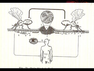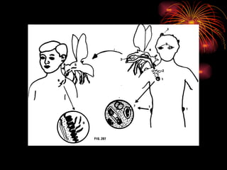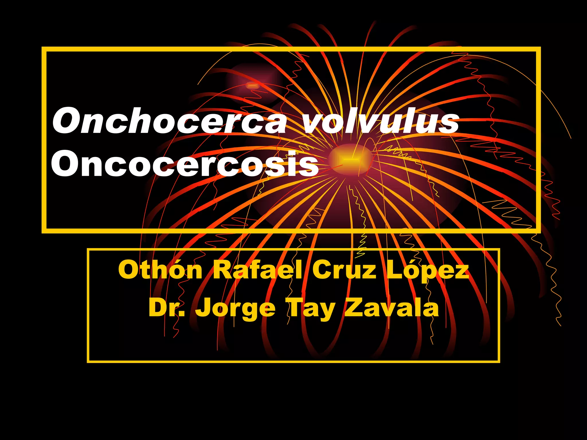 Este documento describe la enfermedad de Oncocercosis, causada por el parásito Onchocerca volvulus y transmitida por mosquitos. Explica la morfología del parásito, su ciclo de vida, manifestaciones cutáneas e oculares de la enfermedad, diagnóstico y tratamiento.