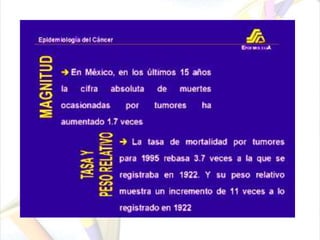Este documento trata sobre oncología y ofrece información sobre las causas, biología y estadificación del cáncer. Explica que en 2007, los tumores malignos fueron la segunda causa de muerte en Jalisco, representando el 13.5% de las defunciones. Describe las causas del cáncer como hereditarias, carcinógenos químicos, físicos y virales. Además, proporciona detalles sobre marcadores tumorales comunes como el PSA, AFP, CA 15-3 y CA 125 que se usan para detectar y monit