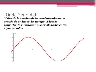 El documento proporciona definiciones de varios conceptos relacionados con ondas senoidal, corriente alterna y electromagnetismo. Explica valores como el valor eficaz, valor RMS, armónicos y reactancia. También define conceptos como impedancia, campo magnético, densidad de flujo magnético, fuerza de Lorentz, histéresis y corrientes parásitas de Foucault.
