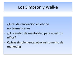 El documento discute cómo las películas Los Simpson y Wall-E abordan temas ambientales como la contaminación y el cambio climático, y si esto representa un cambio en la mentalidad de Hollywood o simplemente es una estrategia de marketing. También menciona otros temas tratados en las películas como la obesidad, la dependencia de la tecnología y las consecuencias de no cuidar el planeta.