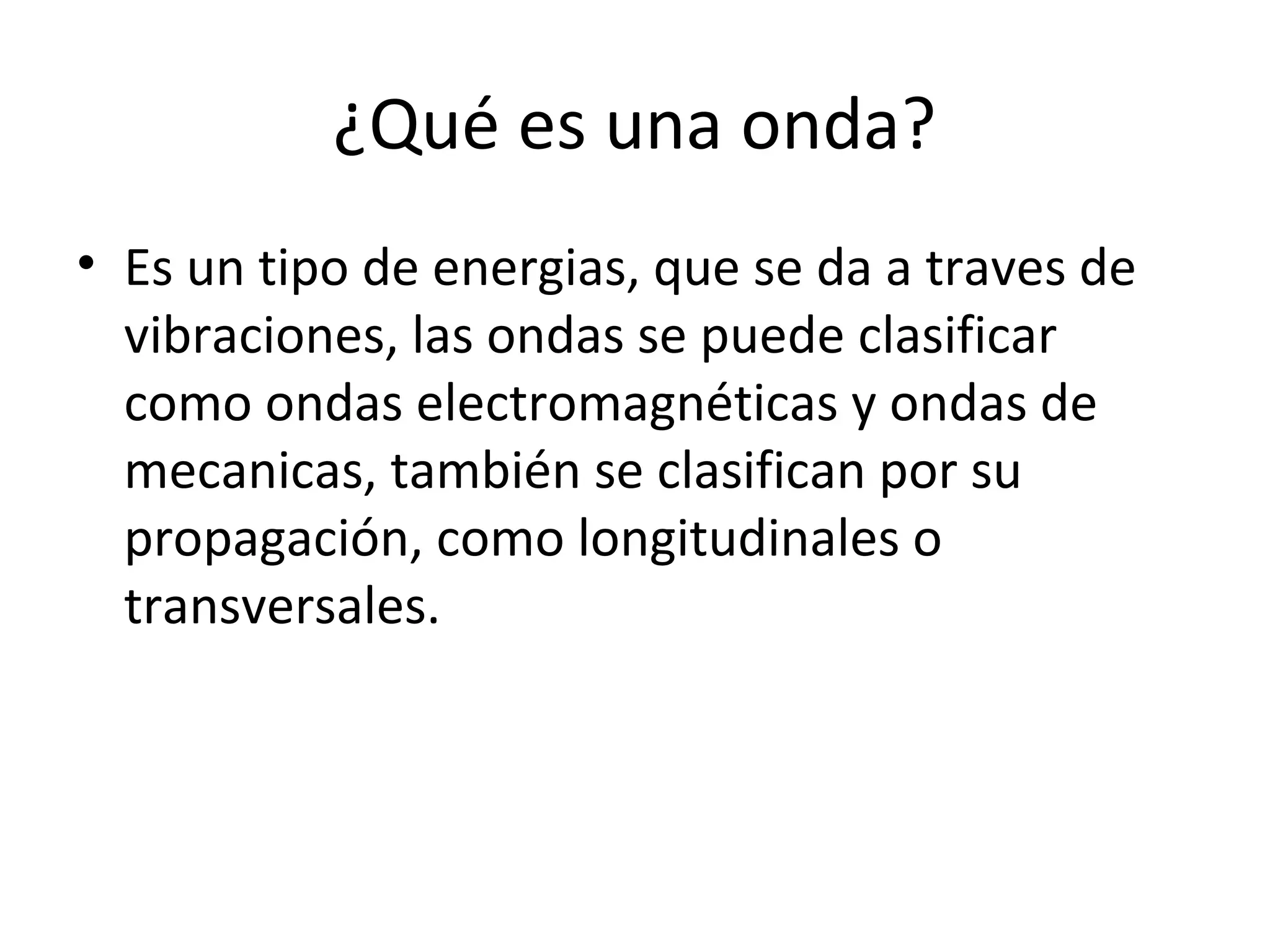 Este documento define qué son las ondas y clasifica diferentes tipos de ondas. Explica que las ondas son una forma de energía que se propaga a través de vibraciones, y pueden ser electromagnéticas u ondas mecánicas. También describe las características de ondas transversales, longitudinales, electromagnéticas y mecánicas, e ilustra ejemplos como ondas de sonido, luz y agua. Además, define conceptos clave como amplitud, longitud de onda, frecuencia y periodo de una onda.