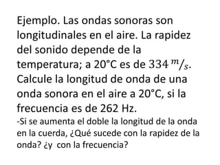 Este documento trata sobre las ondas y sus características. Explica que existen ondas mecánicas que requieren un medio material para propagarse, como el sonido, y ondas electromagnéticas que no necesitan un medio, como la luz. Describe los tipos de ondas mecánicas longitudinales y transversales. Las ondas transportan energía pero no materia y se propagan en forma periódica. Incluye fórmulas para calcular la velocidad, aceleración, potencia y longitud de onda de una onda transversal.