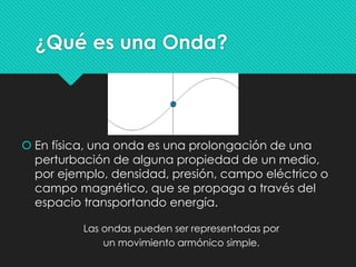 Las ondas son perturbaciones que transportan energía a través de un medio. Se pueden clasificar según su medio (mecánicas, electromagnéticas), su propagación (unidimensionales, bidimensionales, tridimensionales), su dirección de perturbación (longitudinales, transversales) y su periodicidad (periódicas, no periódicas). Las ondas experimentan fenómenos como la difracción, interferencia, reflexión y refracción.