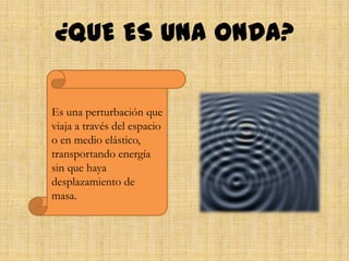 Este documento describe las ondas y cómo se clasifican. Las ondas son perturbaciones que transportan energía a través de un medio sin desplazar masa. Se clasifican según el medio de propagación (mecánicas u ondas electromagnéticas), si son periódicas o de pulso, la dirección de vibración (transversal u longitudinal), y el número de dimensiones.