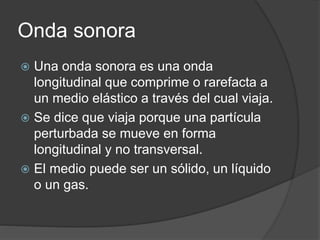 Una onda sonora es una onda longitudinal que comprime y rarefacta un medio elástico como el aire o un sólido a través del cual viaja. La velocidad del sonido depende de las propiedades del medio y es de aproximadamente 340 m/s en el aire a temperatura ambiente. El efecto Doppler ocurre cuando la fuente emisora o el observador se mueven, lo que causa un cambio en la frecuencia percibida de la onda sonora debido a las velocidades relativas.
