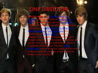 One Direction es una boy band británica-irlandesa formada en 2010 durante el programa de televisión The X Factor en el Reino Unido y compuesta por cinco integrantes: Harry Styles, Liam Payne, Zayn Malik, Niall Horan y Louis Tomlinson. Aunque inicialmente audicionaron como solistas y fueron eliminados, el jurado Simon Cowell los reunió en un grupo debido a su química y potencial, dando origen a One Direction.