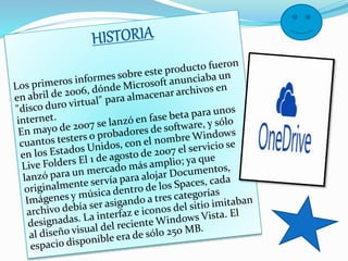 OneDrive permite subir archivos de hasta 2GB desde el programa SkyDrive o 300MB desde la web, explicando los pasos para cargar archivos seleccionados en OneDrive desde la aplicación o agregarlos desde el dispositivo. Ofrece características como compartir enlaces favoritos entre usuarios.