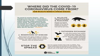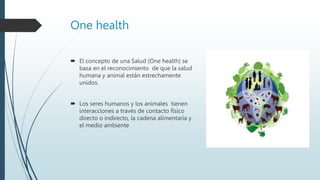 El documento describe el concepto de One Health, que reconoce que la salud humana y animal están estrechamente relacionadas. Los seres humanos y animales interactúan a través del contacto directo e indirecto, la cadena alimentaria y el medio ambiente. Factores como la sobrepoblación, la urbanización, la pobreza, el comercio internacional y los viajes, la destrucción del hábitat y el cambio climático contribuyen a la propagación de enfermedades emergentes, reemergentes y desatendidas que afectan tanto a human
