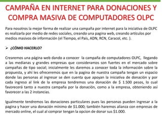 Este documento propone realizar una campaña en internet y redes sociales para recaudar fondos y comprar computadores OLPC. La campaña incluirá una página web que promueva las donaciones y ofrezca a las empresas un enlace para que sus visitantes donen. También se proponen donaciones individuales y por compras en línea. Se estima recaudar $37.5 millones de empresas y $15 millones de individuos, para un total de 146 computadores.