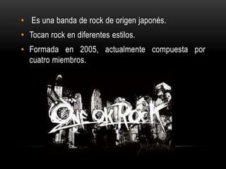 ONE OK ROCK es una banda de rock japonesa formada en 2005 compuesta actualmente por cuatro miembros. Tocan rock en diferentes estilos con un sonido agresivo y melódico. Su popularidad ha ido en aumento rápidamente debido a sus canciones enérgicas y pegadizas que los han hecho conocidos no solo en Japón y Asia sino también en el extranjero.