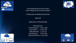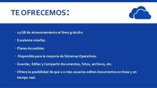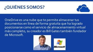 OneDrive es un servicio de almacenamiento en la nube de Microsoft que permite a los usuarios almacenar y acceder a archivos desde cualquier dispositivo. OneDrive ofrece ventajas como tener un respaldo de archivos, compartir contenido fácilmente con otros y acceder a archivos desde cualquier lugar. Algunas desventajas son que el almacenamiento gratuito es limitado y en ocasiones los archivos pueden corromperse.