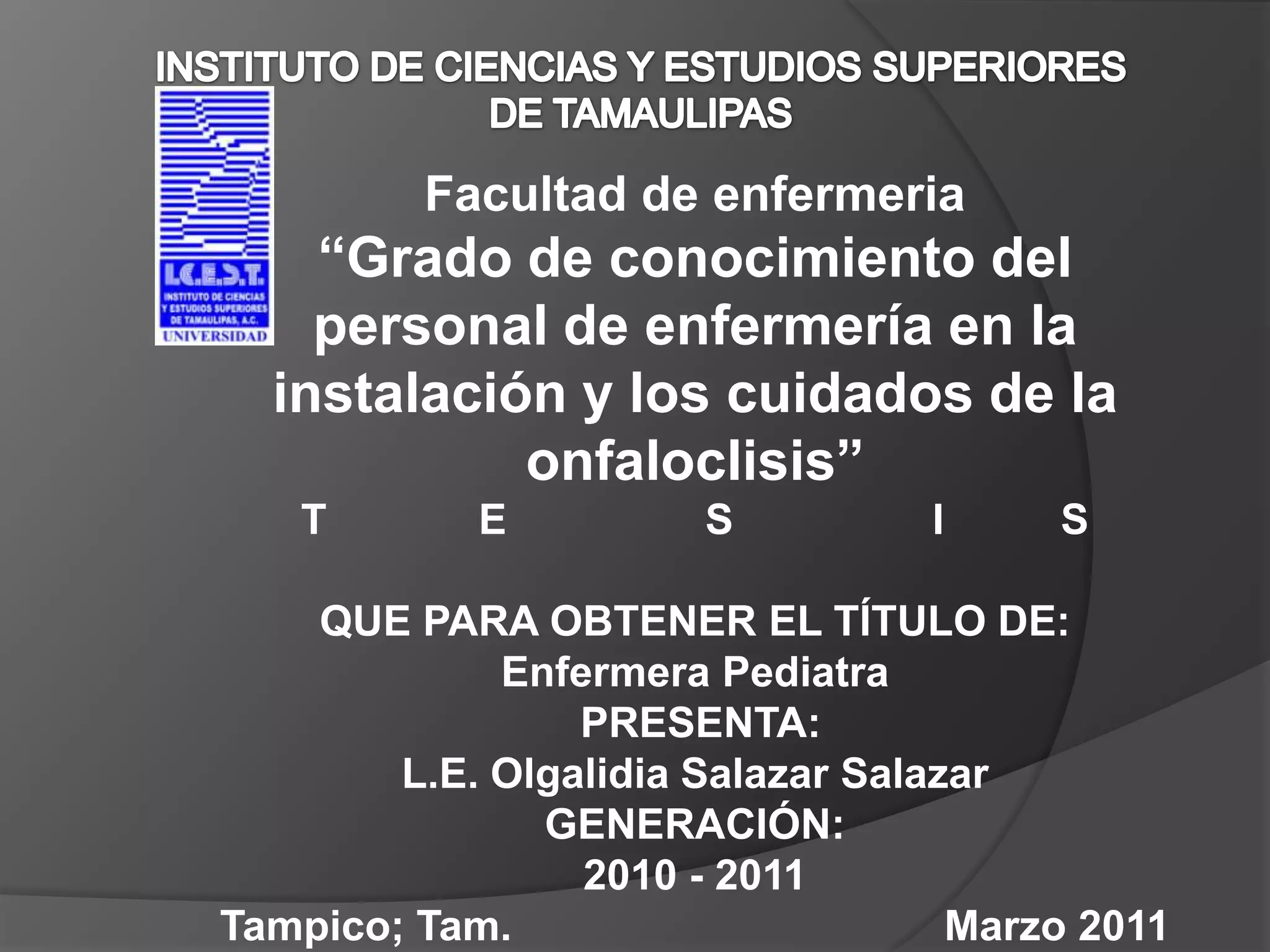 Este documento presenta los resultados de una investigación sobre el grado de conocimiento del personal de enfermería en la instalación y cuidados de la onfaloclisis. Los resultados mostraron que el personal carece de conocimientos suficientes sobre este procedimiento y que no habían recibido capacitación. Se concluye que es necesario capacitar al personal para mejorar la atención a pacientes que requieran onfaloclisis. Se recomienda hablar con los directivos para difundir los resultados y elaborar un manual y curso de capacitación sobre este tema.