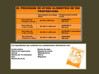 El Organismo de Nutrición Infantil A.C. (ONI) se estableció en 1954 en Guadalajara, Jalisco, para llevar alimentos nutritivos a niños en áreas marginadas e indígenas. El ONI formula y produce complementos alimenticios para niños de acuerdo con las normas de la FAO y la OMS. El ONI atiende a niños desde el embarazo hasta los 5 años para prevenir y tratar la desnutrición a través de programas de alimentación, educación y salud.