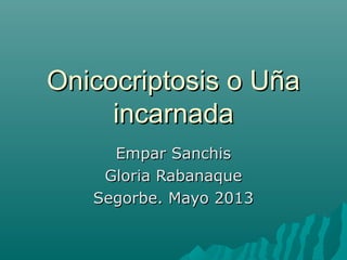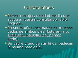 La onicocriptosis es una patología crónica causada por la penetración de los bordes laterales de la uña en los tejidos blandos, lo que suele acompañarse de infección e inflamación. Se presenta en varios dedos de los pies de una paciente y su padre y uno de sus hijos también la padecen, sugiriendo una posible herencia genética. El tratamiento incluye extraer la espícula de uña causante, cambiar el calzado, aplicar antibióticos y en casos graves cirugía para extirpar par