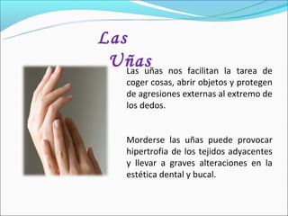 Este documento habla sobre la onicofagia o costumbre de comerse las uñas. Explica que afecta a alrededor del 45% de los menores y puede ser causada por ansiedad o imitación. También detalla algunas consecuencias como hemorragias, infecciones o daño dental. Finalmente, ofrece consejos como identificar los desencadenantes y mantener las manos ocupadas para dejar el hábito.
