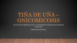 La tiña de uña o onicomicosis es causada principalmente por hongos del género Trichophyton. Es la causa más común de enfermedad ungueal y afecta entre el 18-40% de las onicopatías. Los factores de riesgo incluyen antecedentes de tiña en otras áreas del cuerpo, traumatismos y sistemas inmunes comprometidos. Los síntomas son engrosamiento, opacidad y fragilidad de las uñas con coloración amarillenta u oscura, predominando en las uñas dist
