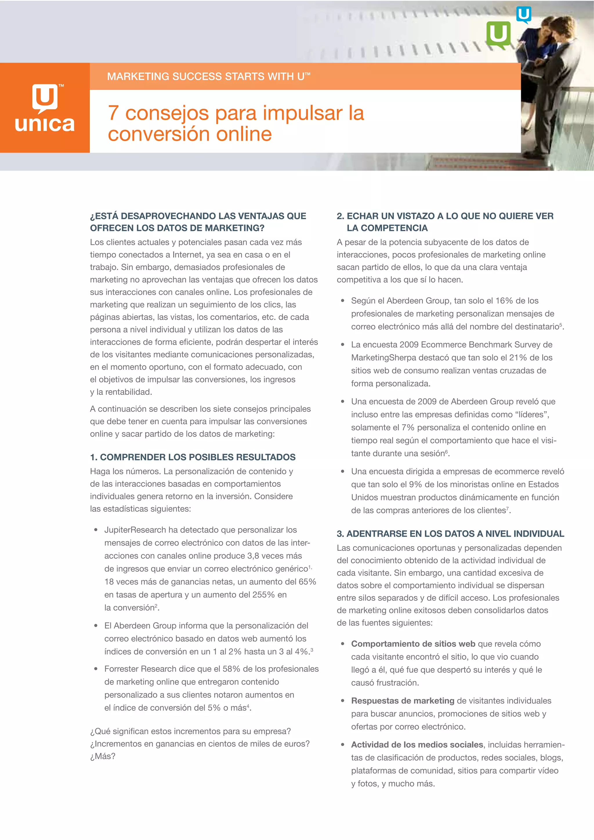 Los 7 consejos para impulsar la conversión online son: 1) comprender los posibles resultados de la personalización, 2) analizar las estrategias de la competencia, 3) profundizar en los datos individuales, 4) trabajar de forma ágil en todas las etapas del marketing, 5) automatizar procesos para mejorar la eficacia, 6) dar más control al departamento de marketing y 7) actuar sobre un conocimiento rápido y fácil.