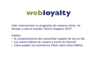 El estudio 'Online Shoppers 2014' de España analiza el comportamiento del consumidor en compras online, revelando que el 62% son compradores habituales y que Amazon y eBay son las plataformas más populares. Se destaca la importancia de la confianza y el momento del día para realizar compras, siendo la noche la preferida por muchos. La gran mayoría de los compradores online está satisfecha con sus experiencias, aunque los gastos de envío elevados y la calidad del producto siguen siendo puntos de insatisfacción.