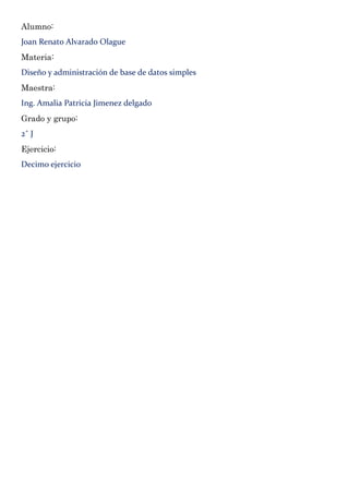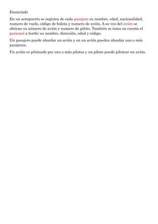Este documento describe un ejercicio de diseño de base de datos para un aeropuerto. Se necesita registrar información de pasajeros como nombre, edad, nacionalidad, número de vuelo y boleta, y número de avión. También se requiere el número de avión, número de piloto, nombre, dirección, edad y código del personal. Un pasajero puede abordar un avión y un avión puede tener uno o más pasajeros. Un avión es piloteado por uno o más pilotos y un piloto puede pilotear un avión.