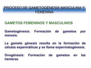 El documento describe los procesos de gametogénesis masculina y femenina. La gametogénesis masculina se llama espermatogénesis y resulta en la formación de cuatro espermatozoides del mismo tamaño a través de meiosis. La gametogénesis femenina se llama ovogénesis y resulta en la formación de un único óvulo funcional grande y tres cuerpos polares que se desintegran, también a través de meiosis. Ambos procesos producen gametos haploides pero difieren en sus resultados finales.