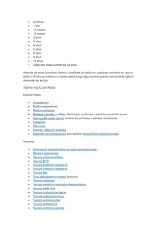 El control sano del niño es un programa que supervisa la salud y desarrollo del menor desde su nacimiento hasta los 6 años, realizando exámenes periódicos para detectar problemas de salud o desarrollo de manera temprana. Estos controles incluyen la medición del peso, talla y aplicación de vacunas, y su frecuencia depende de la edad del niño, siendo más frecuentes en los primeros meses de vida. El objetivo es asegurar el crecimiento saludable del niño y educar a los padres sobre hábitos de