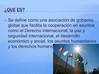 La Organización de las Naciones Unidas (ONU) es una asociación intergubernamental fundada en 1945 tras la Segunda Guerra Mundial para promover la cooperación internacional. La ONU trabaja en áreas como el derecho internacional, la paz y seguridad, el desarrollo económico y social, asuntos humanitarios y derechos humanos. Está compuesta por diversos órganos como la Asamblea General, el Consejo de Seguridad y el Secretario General, y tiene su sede principal en Nueva York.