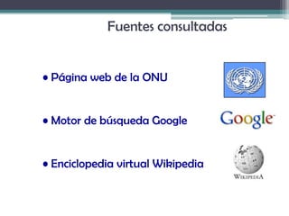 La Organización de las Naciones Unidas (ONU) fue fundada en 1945 tras la Segunda Guerra Mundial con el objetivo de estabilizar las relaciones internacionales y mantener la paz. Actualmente tiene 192 países miembros y su sede principal se encuentra en Nueva York. Sus órganos principales incluyen la Asamblea General, el Consejo de Seguridad, el Consejo Económico y Social y la Corte Internacional de Justicia.