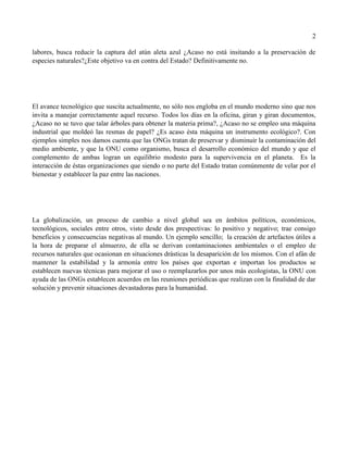 El documento describe el rol de la ONU y las ONGs en cuestiones económicas y su relación con la globalización. Explica que la ONU, a través del Consejo Económico y Social, se encarga de temas como el desarrollo económico, medio ambiente y educación para promover la paz entre las naciones. Las ONGs, como WWF, complementan las funciones del Estado buscando preservar el medio ambiente y especies. La globalización trae beneficios pero también consecuencias negativas, por lo que la ONU