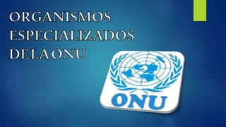 El documento describe la historia y estructura de las Naciones Unidas. Se fundó en 1945 tras la Segunda Guerra Mundial para mantener la paz y la seguridad internacionales. Actualmente tiene 193 estados miembros y su sede central se encuentra en Nueva York. La ONU consta de varios órganos principales como la Asamblea General, el Consejo de Seguridad, el Consejo Económico y Social y la Corte Internacional de Justicia.