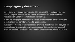 Moodle ha sido desarrollado desde 1999 como un proyecto de software libre. Ha experimentado mejoras importantes en accesibilidad y flexibilidad de visualización. Como no requiere pagos de licencia, una institución puede añadir tantos servidores Moodle como necesite. El desarrollo continúa gracias a programadores voluntarios y usuarios de la comunidad internacional.