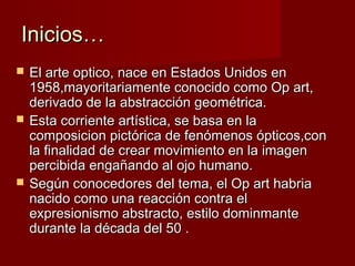 El arte óptico o Op art surgió en Estados Unidos en 1958 como una reacción contra el expresionismo abstracto dominante en esa época. Se basa en composiciones pictóricas que utilizan principios científicos para crear la ilusión de movimiento en la imagen a través de formas geométricas, líneas, patrones y otros efectos ópticos que engañan la percepción visual. Artistas pioneros como Víctor Vasarely y Bridget Riley experimentaron con técnicas como el efecto moaré y el efecto rubin para gener