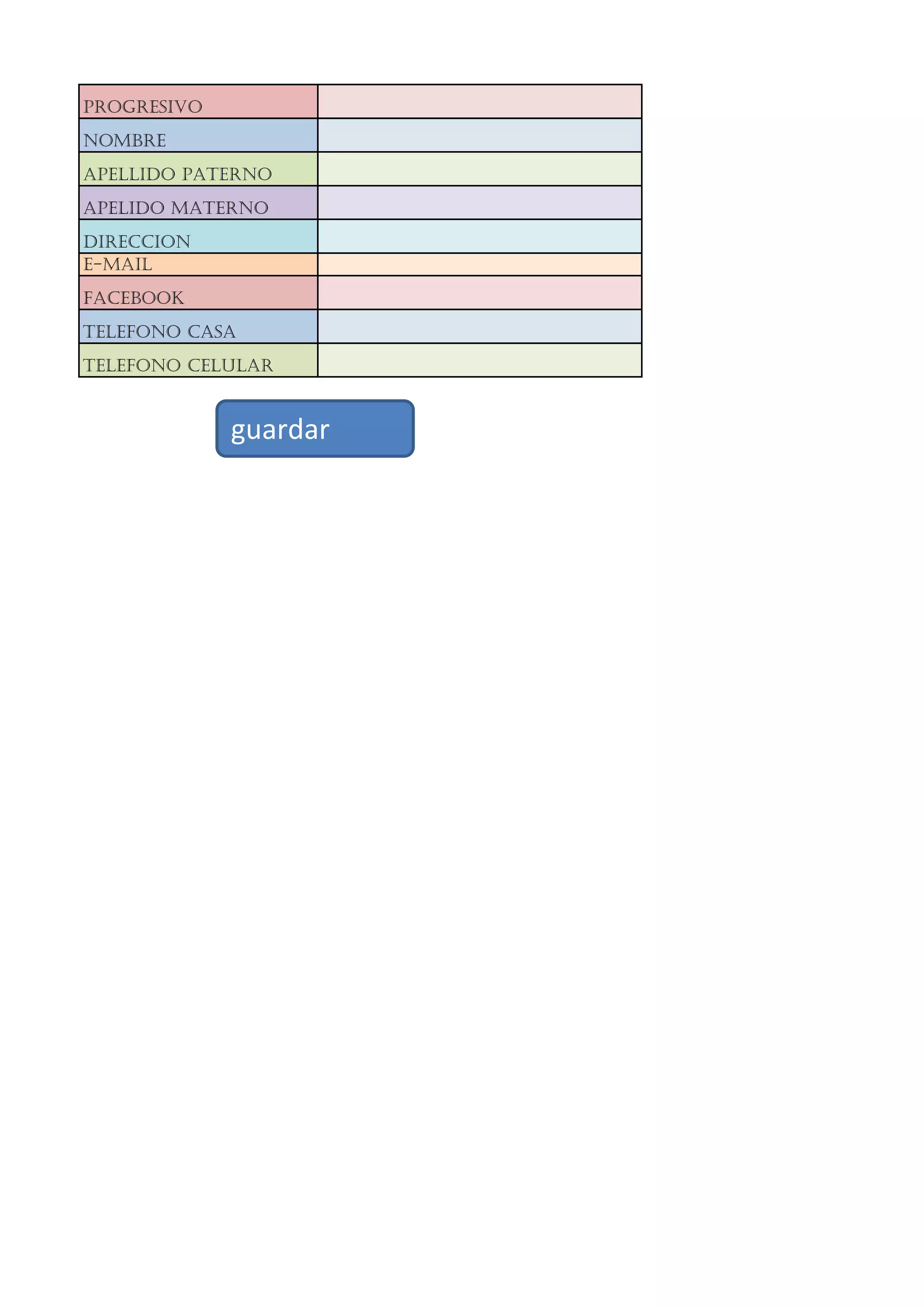 Este documento contiene campos para recopilar información personal básica como nombre, apellidos, dirección, correo electrónico, redes sociales y números de teléfono de una persona.