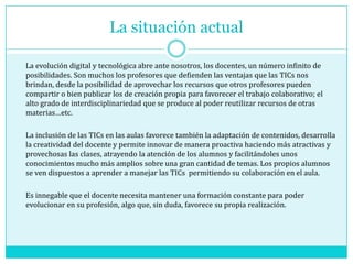 Este documento resume las opiniones de expertos sobre el uso de la tecnología en la educación. Algunos profesores se oponen a su uso, alegando que requiere mucho tiempo y capacitación, y que algunas lecciones no se pueden enseñar completamente en línea. Sin embargo, la mayoría de los expertos creen que las herramientas digitales pueden complementar la enseñanza de manera efectiva y atractiva para los estudiantes, aunque requieran una inversión inicial de los profesores.