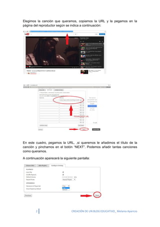 Este documento explica cómo añadir música de fondo a un blog educativo en 3 pasos: 1) Seleccionar un reproductor de música de scmplayer.net y elegir canciones de YouTube copiando sus URLs; 2) Personalizar opciones como volumen y modo de reproducción en el reproductor; 3) Insertar el código HTML del reproductor en la sección de diseño del blog.