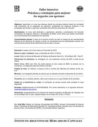 Este documento describe un taller intensivo de 8 clases sobre estrategias y prácticas para mejorar los negocios con opciones. El taller se enfoca en conceptos básicos hasta avanzados de operaciones con opciones y estrategias para optimizar resultados en diferentes escenarios de mercado. El curso está destinado a operadores, gerentes y participantes del mercado de valores y se llevará a cabo los lunes y miércoles de marzo a abril.