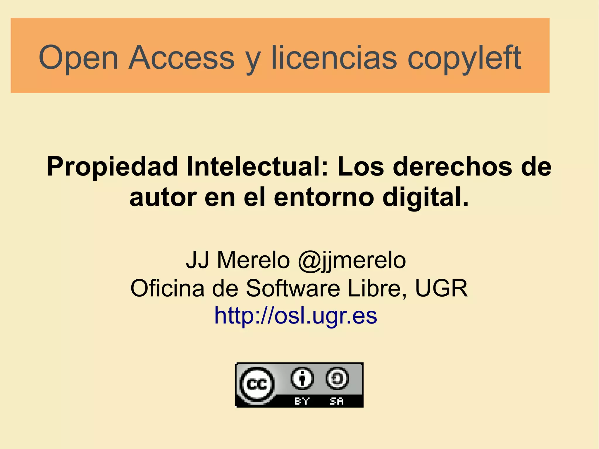 Este documento trata sobre el acceso abierto y las licencias copyleft. Explica que la información debe ser libre y gratuita para todos, y que el conocimiento es un bien común. También describe las licencias Creative Commons, las cuales permiten la reproducción y distribución de obras mientras se atribuye la autoría. El documento promueve el uso de formatos y licencias libres para garantizar la libertad y el intercambio de información.