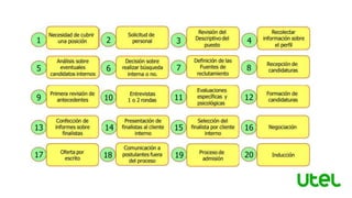 El documento aborda las funciones del departamento de administración del capital humano, centrándose en el proceso de reclutamiento y selección de personal. Se discuten las innovaciones y tendencias actuales, incluyendo el uso de tecnología y nuevos modelos organizacionales, para atraer y retener talentos. Se invita a los participantes a reflexionar sobre estos temas y a subir sus respuestas para obtener puntos adicionales.