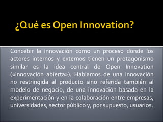 El documento habla sobre la innovación abierta, un proceso en el que actores internos y externos tienen un papel similar en la innovación. Esto incluye la colaboración entre empresas, universidades, el sector público y usuarios. También discute cómo el conocimiento ya no se limita a grandes empresas u organizaciones, sino que está disponible de forma más amplia. Finalmente, describe algunos principios clave de la innovación abierta, como considerar proyectos aunque no encajen completamente en el modelo de negocio actual de una empresa.