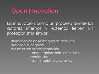 El documento describe el modelo de innovación abierta, donde los actores internos y externos juegan un papel similar en el proceso de innovación. Se basa en la experimentación y cooperación entre empresas, universidades y el sector público. El conocimiento ya no solo se encuentra en centros de investigación sino que está disponible en muchas organizaciones. La innovación abierta considera proyectos que no encajan necesariamente en el modelo de negocio actual pero que pueden ser relevantes para mercados potenciales. También involucra a intermediarios y nuevas métricas para evaluar el pro