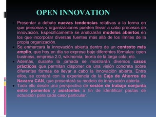 El documento analiza los modelos de innovación abierta, donde las organizaciones incorporan fuentes externas de conocimiento para acelerar la innovación interna y ampliar los mercados. Se discutirán casos prácticos como el modelo de innovación abierta de Caja de Ahorros de Navarra y se identificarán pautas de actuación para cada caso particular a través de una sesión interactiva entre ponentes y asistentes.