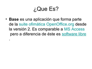 OpenOffice Base es una aplicación de base de datos que forma parte de la suite de ofimática libre OpenOffice, permitiendo crear, administrar y consultar bases de datos de forma sencilla. Incluye características como asistentes, vistas e interfaces para trabajar con tablas, consultas, formularios e informes de una manera fácil de usar. Es comparable a Microsoft Access pero es software libre con licencia GPL.