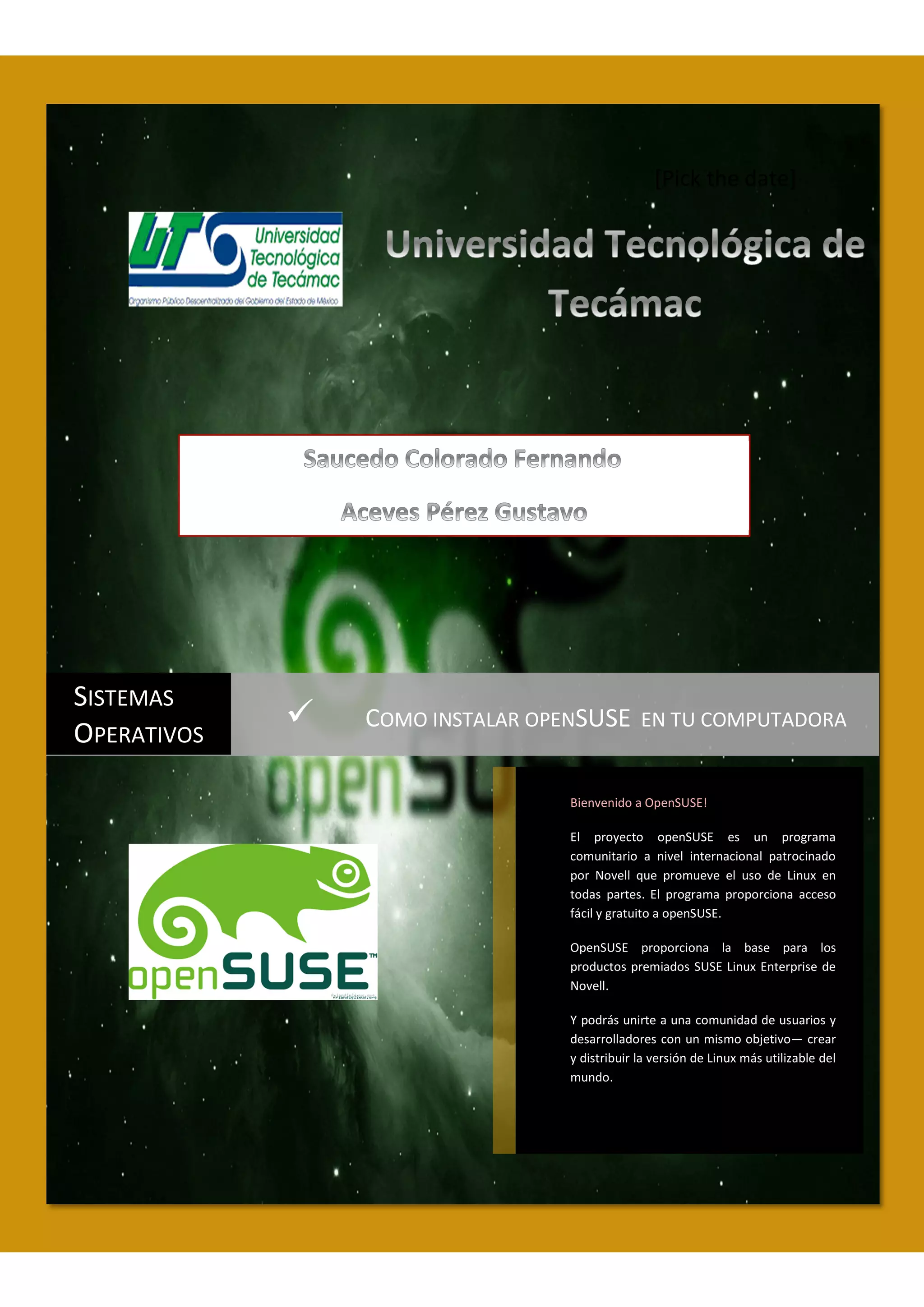 El documento describe los pasos para instalar la distribución Linux openSUSE en una computadora. Explica que openSUSE es un proyecto comunitario internacional que promueve el uso de Linux y ofrece acceso gratuito a la distribución. Luego detalla los nueve pasos para instalar openSUSE, incluyendo comprobar los requisitos del sistema, seleccionar el idioma, particionar el disco, crear un usuario, y finalmente reiniciar para completar la instalación.