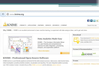 El documento presenta una introducción a la minería de datos utilizando KNIME, explicando su importancia en la extracción de información de grandes volúmenes de datos en diversos contextos. Se definen las técnicas de minería de datos, que incluyen agrupamiento, reglas de asociación y predicción, ilustrando con ejemplos prácticos como la clasificación de perfiles de usuarios y la evaluación de campañas de marketing. Además, se muestra cómo estas técnicas pueden ayudar en la toma de decisiones en negocios, educación, y otros ámbitos.