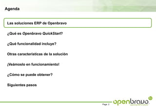 Este documento presenta OpenbravoQuickStart, una solución ERP para pequeñas empresas de Openbravo. Explica que OpenbravoQuickStart proporciona una implementación preconfigurada de Openbravo ERP que puede implantarse rápidamente en 2-3 semanas e incluye funcionalidad básica como gestión de compras, ventas, almacén y finanzas. También describe cómo puede extenderse para cubrir necesidades específicas y crecer junto con la empresa.