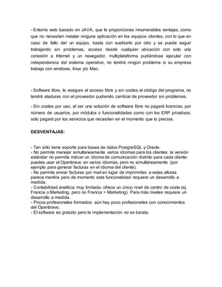 Openbravo ERP es una aplicación de gestión empresarial del tipo ERP destinada a pequeñas y medianas empresas. Es una aplicación web basada en Java que se ejecuta en Apache y Tomcat y admite bases de datos PostgreSQL y Oracle. Ofrece módulos para gestión de datos, aprovisionamiento, almacenes, proyectos, producción, comercial, finanzas y contabilidad. Un caso de éxito fue su implementación en Johnson Controls para estandarizar procesos entre distribuidores y mejorar el servicio al cliente y la toma de decisiones.
