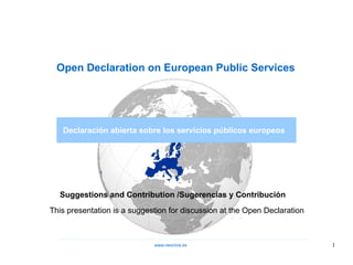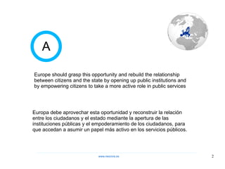 El documento propone tres principios básicos para los servicios públicos europeos: transparencia, participación ciudadana y empoderamiento. Aboga por la transparencia de las instituciones públicas, la participación ciudadana en el diseño de políticas y servicios, y que las instituciones actúen como plataformas para que los ciudadanos creen valor público. También promueve la inclusión digital, el software libre y la reducción de asimetrías entre países de la Unión Europea.